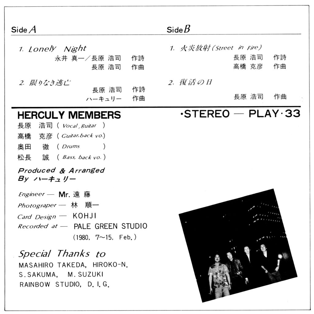 1980年4月頃、4曲入りLPレコードをリリース!録音は赤坂ペイルグリーンスタジオ。この当時は、デジタルなんて言葉を耳にすることもなかった時代、スタジオにオペレーターがついて、元音源は8mmリールテープ(でいいのかな?)仮にこれが残っていたとしても、今は再生機が消滅しています。今で言うインディーズレーベルですが、初回500枚プレス、身内で100枚ほど捌きましたから、実質400枚ほどですが、全て完売しました。結構人気があったんですよ(笑)ジャケット写真と、4曲の中から、復活の日〈サウンド〉を紹介します。